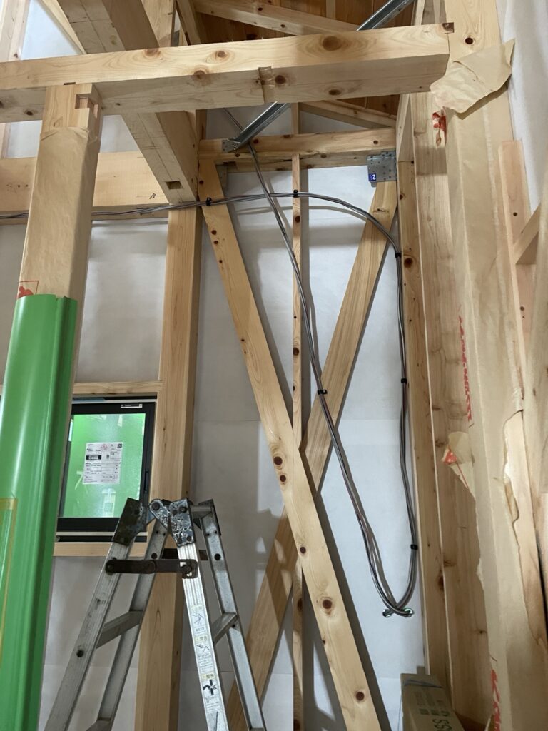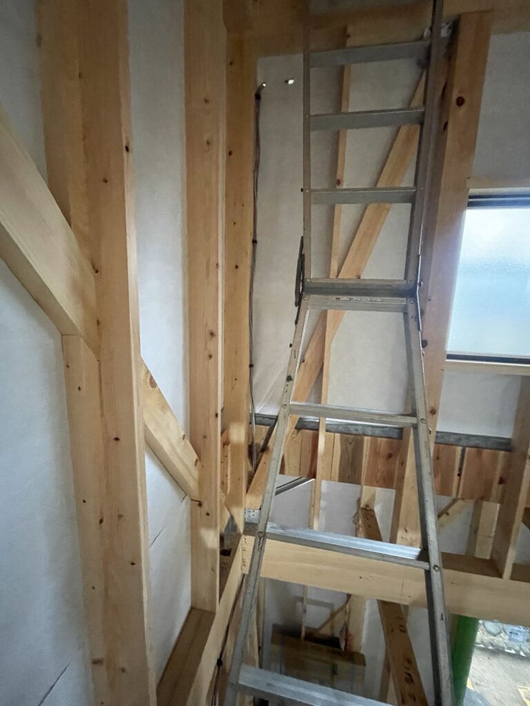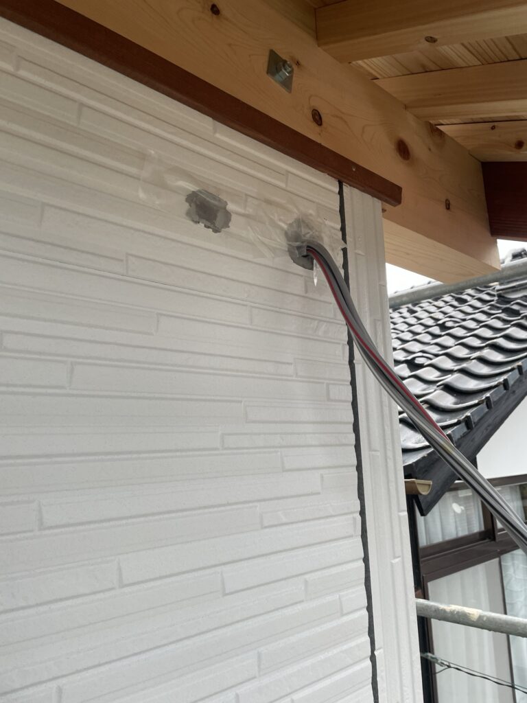 外壁貼れてきたので。幹線の配線、受け側の配線が短かったかな?ちょっと動かしてやり直し、サイディングが脆い反対側からあけるとハジッてる。コーキングしといて貰おう